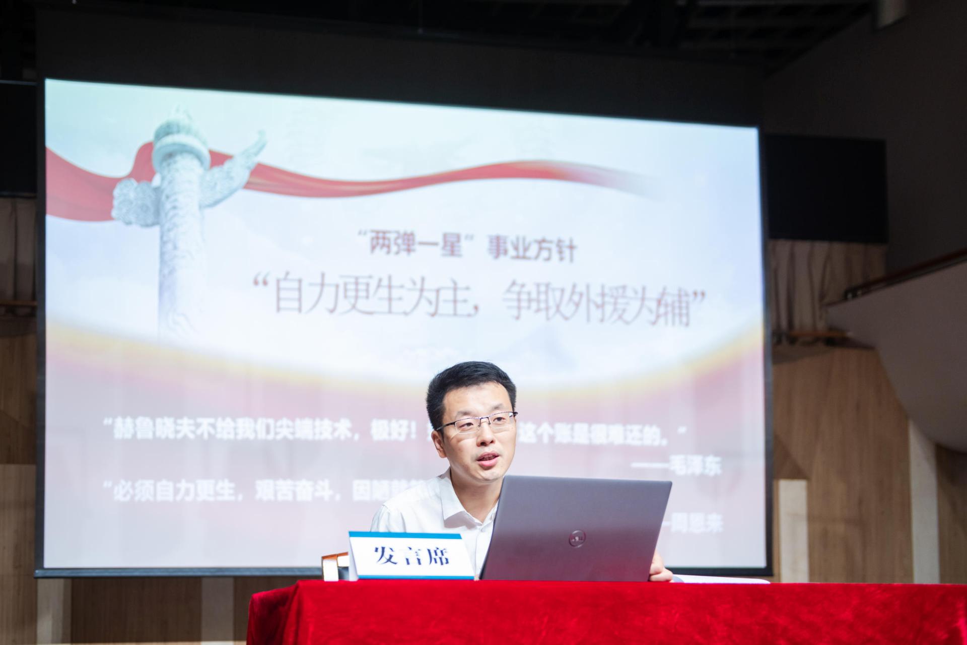 南京航空航天大学能动学院党委书记、最美教师、党的二十大代表徐川讲起了老一辈科学家干惊天动地事、做隐姓埋名人的感人故事,阐释了以“热爱祖国、无私奉献,自力更生、艰苦奋斗,大力协同、勇于登攀”为内涵的“两弹一星”精神。徐川表示,对历史最好的纪念是创造全新的历史,对精神最好的传承是弘扬伟大的精神。党的二十届三中全会提出了推进高水平科技自立自强的战略目标,希望同学们从伟大的“两弹一星”精神中汲取力量,奋力书写为中国式现代化挺膺担当的青春篇章。