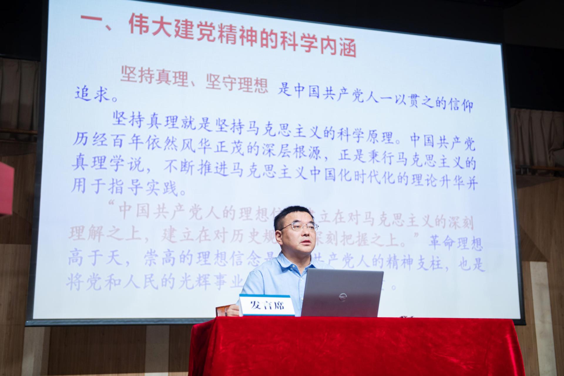 副校长刘宏达从中共一大代表陈潭秋、李汉俊、刘仁静的故事讲起,讲述了我校的红色人物、红色历史和红色文化。刘宏达表示,希望借助此次示范宣讲的契机,将红色资源作为坚定理想信念、加强党性修养的生动教材,教育引导广大党员干部永葆初心、勇担使命,深入学习宣传贯彻党的二十届三中全会精神和全国教育大会精神,全面推动中国共产党人精神谱系的宣传教育融入党的建设和思想政治工作,贯穿教育教学全过程,使红色基因能够在师生中代代相传,让革命理想之花在学校永远绽放。